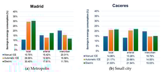 On the other hand, the direct results of this investigation, indicated by the energy consumption (L/100 km, kWh/100 km), are shown in Table 8. However, to be comparable (for different vehicle types), the reduction in these consumptions (the energy savings) of eco-driving techniques in the experiment scenarios is provided in Figure 8. It distinguishes the results by road type (local, arterial, and interurban) and vehicle type (manual ICE, automatic ICE, and EV). Additionally, it provides the results for Madrid and Caceres cities, representing a large and a small city, respectively.