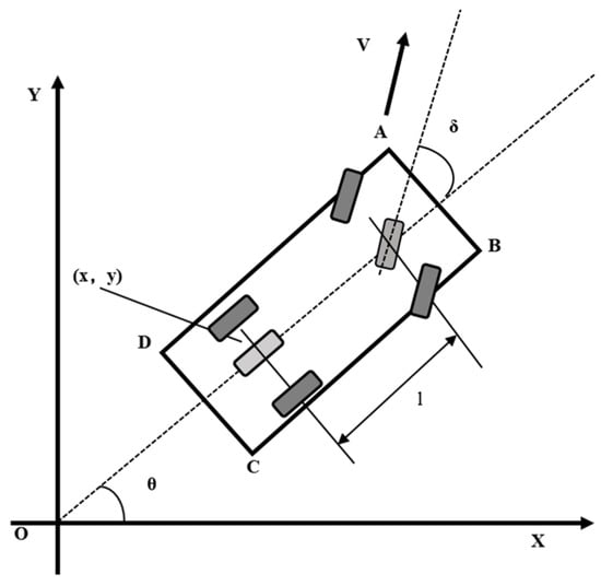 In the parking process, the vehicle typically operates at speeds below 5 km/h, where lateral sliding of the wheels is generally negligible. For simplicity, the wheels are assumed to perform only rolling and steering motions, and the vehicle is modeled as a rigid body [25]. This assumption neglects factors such as tire deformation and frictional forces that might affect the vehicle’s motion in real-world conditions. Based on the Ackermann steering principle, a kinematic model of the vehicle was constructed, as shown in Figure 1. While this simplified model is useful for path planning in controlled environments, it may not fully account for the complexities of vehicle dynamics in more challenging parking scenarios, such as those involving steep slopes or low-traction surfaces.