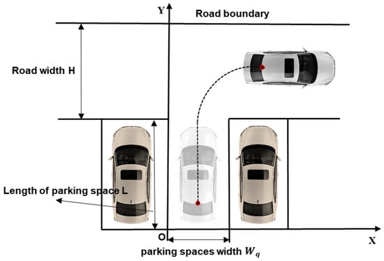 This study primarily focuses on vertical parking spaces, and its simplified model is shown in Figure 2. The direction perpendicular to the parking space is defined as the X-axis, while the direction parallel to the parking space is defined as the Y-axis, establishing the global coordinate system for vertical parking. Considering the generality of the path planning algorithm, according to the ISO 16787 standard [26], for test vehicles with a length of 4 m or less, the parking space length is equal to the length of the test vehicle , and the parking space width is the width of the test vehicle plus 1.2 m. The road width is 4.5 m. The relevant parameters are shown in Table 2.
