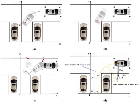 Based on these conditions, the arc radii of the upper and lower boundaries of the feasible vertical parking region, and , as well as the coordinates of the intersection points of the arc and the line, and , can be determined, thereby defining the feasible parking path region, as shown in Figure 3d.