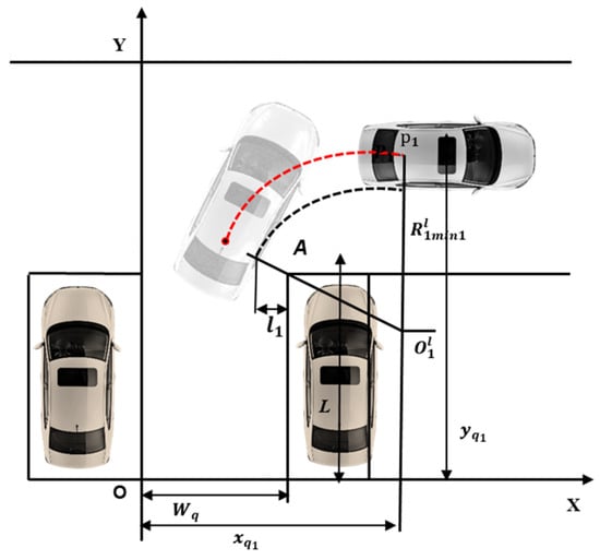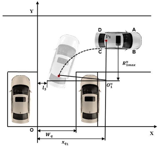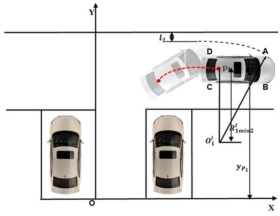 First, the lower bound of the feasible driving region for vertical parking is determined. As shown in Figure 4, when the vehicle moves along a smaller arc from the parking starting point, the right side of the vehicle is likely to collide with the upper-right corner of the parking space. To avoid this collision and maintain a safe distance at point , the first limiting value of the lower bound arc radius can be calculated based on geometric relationships.