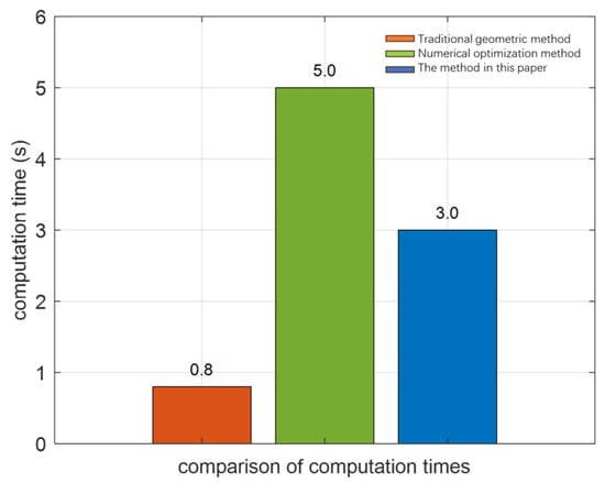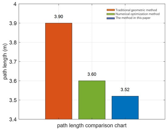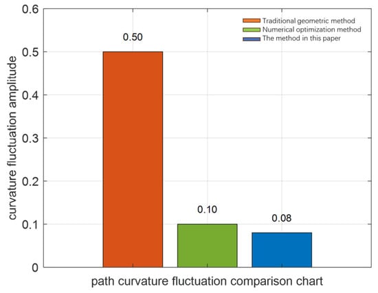 By setting weight coefficients to balance safety, comfort, and economy, the proposed method was implemented on the MATLAB R2020b platform and compared with traditional geometric methods and numerical optimization methods. The experimental results show that the path generated by the proposed method has a length of 3.52 m, which is 15% shorter than the traditional geometric method and 2% shorter than the numerical optimization method, as shown in Figure 7. The time required to generate the path is 3.0 s, 40% shorter than the numerical optimization method, but slightly higher than the 0.8 s of the traditional geometric method, as shown in Figure 8. Additionally, the curvature fluctuation amplitude of the path is 0.08, which is 80% lower than that of the traditional geometric method and comparable to the 0.1 of the numerical optimization method, as shown in Figure 9. Overall, the proposed method significantly optimizes path length, curvature smoothness, and computational efficiency, with specific comparative results shown in Table 3.