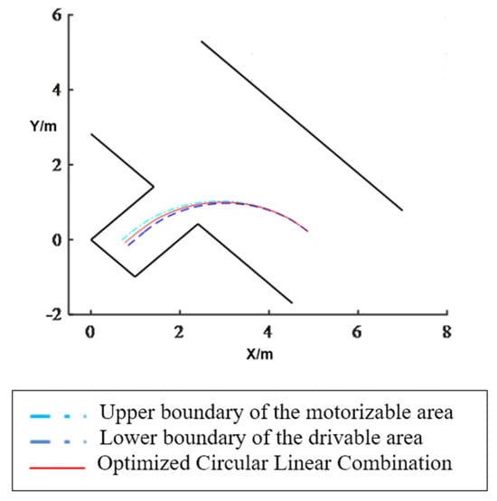 The parking starting point coordinates (3.3, 3.6) were chosen for calculation. Using Matlab R2020b, the optimal combination of circular arcs and straight lines within the drivable area was obtained, as shown in Figure 10. The radius of the circular arc corresponding to the upper boundary of the drivable area is 2.8 m, while the radius corresponding to the lower boundary is 2.6 m. The optimal combination of circular arcs and straight lines has a circular arc radius of 2.7 m, situated in the middle of the drivable area.