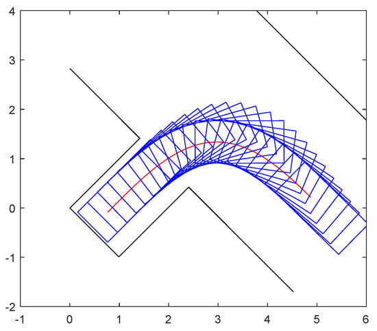 The simulation scene is designed based on the standard “Performance Requirements and Testing Methods for Intelligent Parking Assist Systems” (GB/T 41630-2022) [27], selecting the geometric characteristics of a typical small car. The specific parameters are as follows: vehicle length is 2 m, width is 1.4 m, and wheelbase is 2.8 m; parking space length is 5 m and width is set to 3 m; road width is 4.5 m, with a safety margin of 0.05 m reserved; the minimum turning radius is 1.8 m.