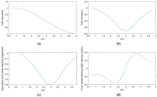 (a) The derivative of the vertical parking path curve; (b) the curvature of the vertical parking path curve; (c) the equivalent steering angle of the front wheels of the path curve; (d) the equivalent steering angle speed of the front wheels of the path curve.