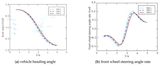 To demonstrate the path planning performance for different parking start points, two additional sets of start coordinates, (3.2, 3.5) and (3.4, 3.7), were proportionally selected based on the initial start point (3.3, 3.6). A quartic polynomial was used for fitting. Due to the coordinate system being rotated counterclockwise by 45°, the heading angle value of 0.7 after rotation corresponds to a heading angle value of 0 before rotation. From Figure 13a, it can be observed that for the three different start points, the vehicle’s heading angle at both the start and endpoints is 0, meeting the requirement for the vehicle’s initial and final states to be parallel to the parking space. As shown in Figure 13b, the absolute value of the vehicle’s maximum front wheel steering angle rate for all three paths is 0.403 rad/s, which satisfies the condition of being less than the vehicle’s maximum front wheel steering angle rate of 0.478 rad/s, thus meeting the kinematic constraints.