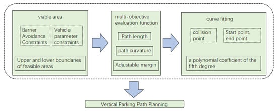 This research proposed a path planning method for vertical parking scenarios based on a combination of circular arcs, straight lines, and a multi-objective evaluation function, as illustrated in Figure 14. By analyzing the boundary limits of the vehicle’s outer profile and the parking space, the upper and lower boundaries of the drivable area were determined through tangent points between circular arcs and straight lines. A multi-objective evaluation function was designed, based on path curvature, adjustable margin, and path length, to derive the optimal combination of circular arcs and straight lines within the drivable area. Subsequently, polynomial curves were employed to fit the optimal combination of circular arcs and straight lines, resulting in the generation of an optimal reference path. Simulation results indicate that the planned path satisfies the continuity of path curvature and adheres to the constraints of vehicle dynamics.