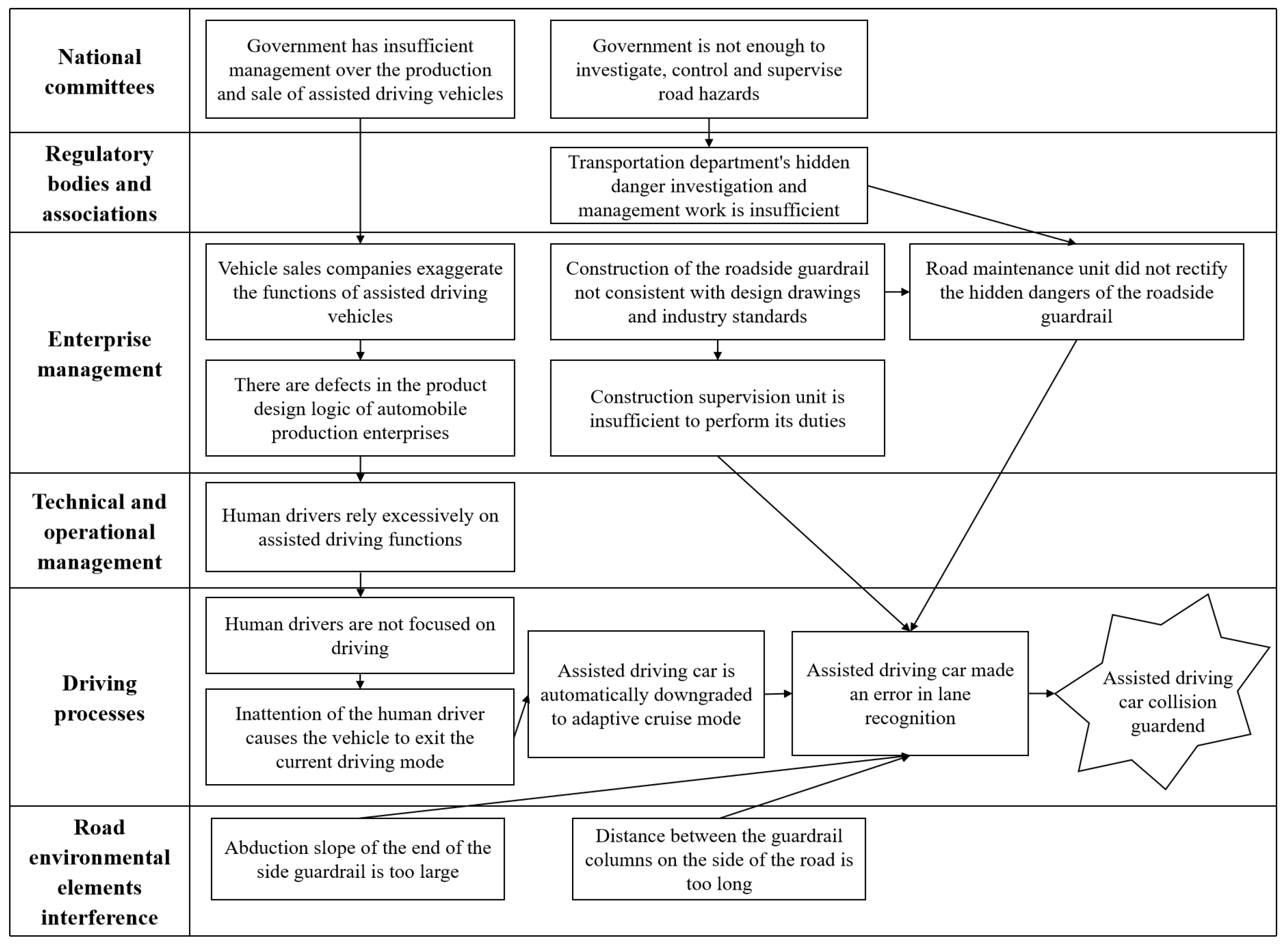 At present, the investigation of automobile traffic accidents involving assisted driving functions is still in its infancy. SAE International released the recommended guidelines for data sets required for autonomous vehicle accident investigation in 2020 to guide the collection of accident data and improve the design of high-level autonomous driving products [1]. The National Highway Traffic Safety Administration and the National Transportation Safety Board (which began investigating accidents involving Tesla and other assisted driving vehicles in 2021) The focus is on the collision emergency lights of auxiliary driving vehicles under poor lighting conditions, illuminated traffic sign boards and warning piles [2]. Alfredo Garcia [3] studied the applicability of existing road alignment and autonomous vehicles, and analyzed the relationship between the maximum operating speed that can be achieved by the autonomous driving system and the road design speed and curve radius, without considering the impact of road facilities, environment and other factors on the operation safety of assisted driving vehicles. Nastaran Moradloo [4] et al. used unsupervised machine learning methods to find the causes of traffic accidents of autonomous vehicles, and put forward influencing factors such as obstacles, unclear road marking and sudden changes in traffic flow. Guo Yanyong [5] believe that future studies should explore the driver takeover performance evaluation system in the context of human-machine co-driving of networked autonomous driving, so as to conduct refined accident risk causation analysis, traffic safety modeling and evaluation, and accident risk prevention and control strategies and algorithms. Wang Xuesong [6] analyzed the relationship between road alignment design, intersection geometry design and automatic driving perception ability, and found that design indexes such as flat curve radius, chord length and curve deflection Angle affect the visual distance of automatic driving, and road type, flat curve curvature and lane width have a significant impact on automatic driving failure events. The recognition accuracy of automatic driving will be affected by the reflective performance of traffic signs and the setting position, and the failure probability is related to the size of traffic marks, the brightness coefficient of reverse reflection and the extension line. Chen Jiqing [7] based on the accident data in the national vehicle accident in-depth investigation system, selected five scene elements according to traffic environment elements and basic information of test vehicles, analyzed the vehicle traffic accident data through unique coding and cluster analysis methods, and proposed and analyzed the characteristics of dangerous accidents combined with the typical vehicle collision risk scenarios obtained by clustering. Fifteen autonomous driving test scenarios involving road section types were constructed. Scholars mainly focus on the operational reliability of the autonomous driving system at level 3 and above [8], and the perceived stability requirements of the autonomous driving system on road environment elements, etc. [9], and lack of research on the traffic accident investigation of cars equipped with auxiliary driving functions at level 3 [10] and autonomous driving vehicles with partial auxiliary driving functions at level 3 and above [11]. In particular, the relevant contents and methods of the investigation of road environmental disturbance factors [12]. Therefore, how to scientifically and systematically complete the causation analysis of road environment interference factors under the condition that the assisted driving function is opened [13], and support the rapid search of the causation of automobile traffic accidents involving the assisted driving function and the accurate identification of accident responsibility under the man-machine co-driving mode, is a key issue that needs to be solved urgently [14]. This paper focuses on the investigation of traffic accidents involving cars with assisted driving functions enabled in man-machine co-driving mode, encompassing vehicles equipped with assisted driving functions below L3 level and autonomous vehicles with partial assisted driving functions activated at L3 level and above. Utilizing the Systems-Theoretic Process Analysis (STPA) framework, this study analyzes the structure of the vehicle control layer, driving execution layer, and control feedback layer during traffic accidents involving assisted driving vehicles.Drawing upon research on vehicle-related and driver-related investigation items in assisted driving vehicle accidents, and incorporating the findings from the analysis of road environment interference layer within the STPA framework, this paper employs the Accident Map (AcciMap) method to conduct an in-depth exploration of typical traffic accident cases involving assisted driving vehicles. Furthermore, it delves into the investigation of road and environment-related interference factors, such as road static facilities, traffic dynamic characteristics, and instantaneous weather conditions. Correlation analysis is conducted for each element across different levels, clarifying the logical relationships and influence mechanisms both within and between these levels.