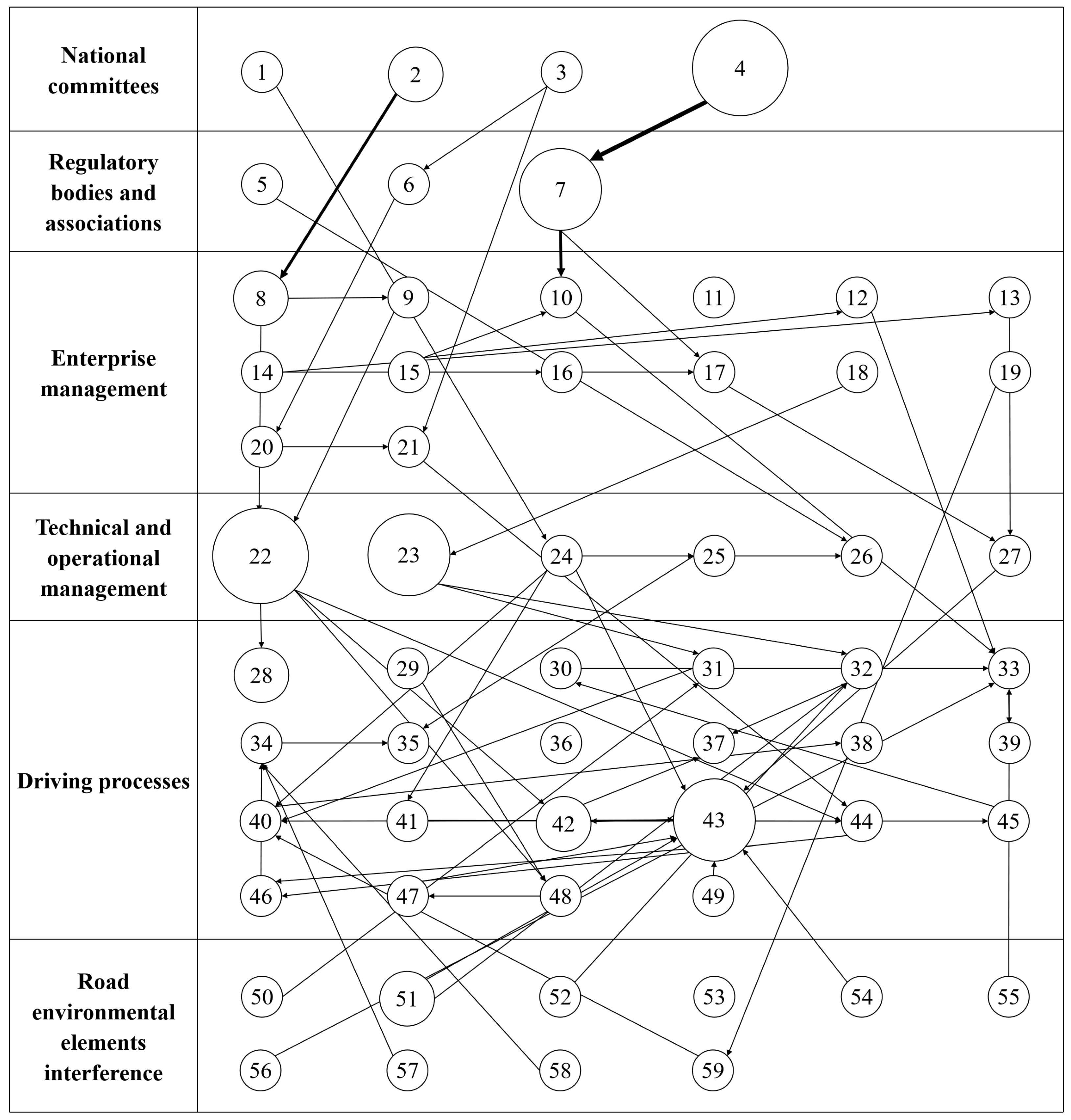 Using AcciMap method to analyze the causes of typical assisted driving vehicle accidents from 6 levels, the causes of each accident are summarized. In the AcciMap analysis of 5 accidents, a total of 104 accident causes were identified, among which 46 causes were separate and 58 factors were similar to other causes. After classifying and combining the same accident causes, a total of 59 accident factors were obtained, as shown in Figure 4, which described the accident causes corresponding to each accident participant. N indicates the number of times the cause occurs. As shown in Figure 5, the size of the circle and the thickness of the connecting line in the figure respectively represent the number of occurrence of the accident cause and the number of the accident cause connection. The AcciMap map corresponds to the number in the accident element map. In AcciMap, the direct causes of accidents can be summarized as human drivers’ over-reliance on the auxiliary driving function and the application limitations of the auxiliary driving function, which are specifically manifested as human drivers speeding and not paying attention to driving for a long time. The auxiliary driving vehicle failed to identify the heavy special operation vehicle in front of it, failed to identify the support pier located in the center of the lane, failed to identify the lane, failed to identify obstacles such as piles and drums. The causal relationship between accident causes and accident causes at different levels in the AcciMap analysis will be explained next.