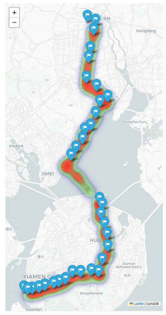 Figure 2 illustrates GPS trajectories mapped in the World Geodetic System 1984 (WGS-84) coordinate system, combined with a heatmap visualization. Stations are marked as flag icons, while the color gradient from green to red represents the increasing frequency of vehicle GPS locations along the route.