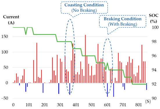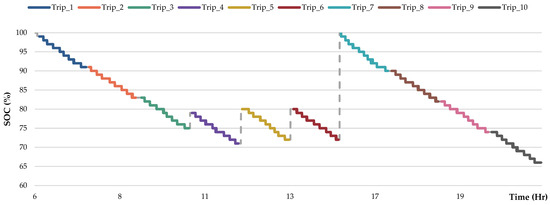 Using these criteria, the start and end points of each trip were determined. Figure 5 illustrates an example of daily discharge cycle segmentation into individual trips, where the vertical axis represents the EB State of Charge (SOC). Through this process, a total of 11,333 trips were identified for analysis.