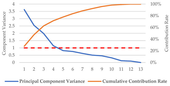 Through the PCA of the 13 standardized features, we identified the first four principal components as having eigenvalues greater than 1, accounting for only 71.57% of the total variance. Including the first six principal components would exceed 80% variance contribution. Thus, a compromise was made to select the inflection point in the plot, choosing the first five principal components, which collectively account for 77.85% of the total variance, as depicted in Figure 6. These five components were selected to represent the original feature set.