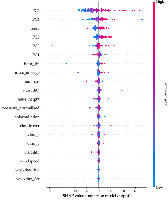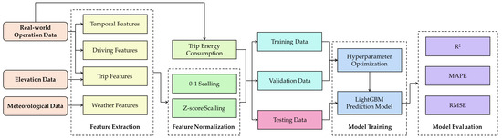 Therefore, our study presents a comprehensive approach that first evaluates EBs’ transmission system efficiency, encompassing both electrical power transfer and mechanical transmission efficiency, through traction modeling and regenerative braking analysis to achieve more accurate trip-level energy consumption evaluations. We developed a dynamic passenger load estimation method using traction data and incorporated key trip characteristics, including inter-stop distances and elevation changes. Our model integrates temporal features, weather conditions, and driving patterns to create a trip-level energy consumption prediction framework based on a Light Gradient Boosting Machine (LightGBM). With hyperparameter tuned through Bayesian Optimization (BO), our model achieved exceptional prediction accuracy with a mean absolute percentage error (MAPE) of 3.92% and root mean square error (RMSE) of 1.398 kWh on the test set. The model’s superiority was validated through comparative analysis with alternative approaches, while maintaining low memory requirements suitable for IoT deployment. Additionally, we utilized SHapley Additive exPlanations (SHAP) values and sensitivity analysis to generate practical recommendations for energy-efficient operations.