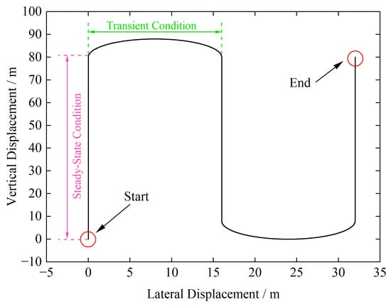 The test route is mainly divided into two parts: the straight area and the U-turn area. According to the change in the reference path curvature, it is divided into three working conditions: steady-state working condition, instantaneous working condition, and total working condition. The tractor driving the entire path is the total working condition, the straight driving section is the steady-state working condition, and the U-turn area is the instantaneous working condition. The specific reference trajectory is shown in Figure 6. The intelligent hybrid articulated tractor starts from the origin (0, 0), drives 80 m in the positive direction of the y-axis, turns around, drives 80 m in the negative direction of the y-axis, turns around again, and then continues to drive 80 m in the positive direction of the y-axis to end the movement.