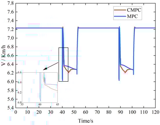 In order to facilitate calculation and analysis, the first straight driving path is selected as the steady-state condition, the first U-turn area is selected as the transient condition, and the simulation results of the first 120 s are selected for analysis. The reference speed is set to 7.2 km/h, and the actual speed curves and path tracking errors of the CMPC algorithm and the MPC algorithm are shown in Figure 7, Figure 8, Figure 9, Figure 10, Figure 11 and Figure 12.