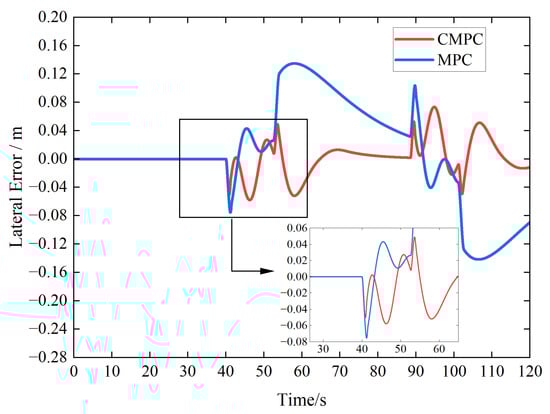 As shown in Figure 8, the lateral error diagram of the tractor under the MPC and CMPC methods. Under steady-state conditions, the lateral errors produced by MPC and CMPC for path tracking are both small: the lateral errors of CMPC and MPC are stable within 0.01 m. Under transient conditions, the control effect of CMPC is better than that of MPC: the lateral mean absolute error of CMPC is 0.009, and the lateral error standard deviation is 0.031; the lateral mean absolute error of MPC is 0.011, and the lateral error standard deviation is 0.12. The lateral tracking error of CMPC is reduced by 18.2% compared with that of MPC. Under total conditions: the lateral error range of CMPC is within 0.07 m, and the lateral error range of MPC is within 0.14 m. Among them, the standard deviation of the lateral error of CMPC is 0.024, and the standard deviation of the lateral error of the MPC algorithm is 0.071. The lateral mean absolute error of CMPC is 0.0058, and the lateral mean absolute error of the MPC algorithm is 0.0063. The lateral tracking error of CMPC is reduced by 50% compared with that of MPC.