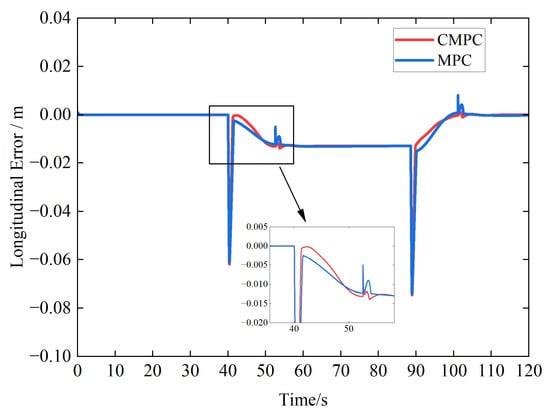 As shown in Figure 9, the longitudinal error diagram of the tractor under the MPC and CMPC methods. Under steady-state conditions, the longitudinal errors of MPC and CMPC in path tracking are both small: the longitudinal errors of CMPC and MPC are stable within 0.01 m. Under transient conditions, the longitudinal mean absolute error of CMPC is 0.026, and the longitudinal error standard deviation is 0.01; the longitudinal mean absolute error of MPC is 0.033, and the longitudinal error standard deviation is 0.01. The longitudinal tracking error of CMPC is reduced by 21.2% compared with that of MPC. Under total conditions, the longitudinal error range of CMPC is within 0.07 m, and the longitudinal error range of MPC is within 0.07 m. Among them, the standard deviation of the longitudinal error of CMPC is 0.008, and the standard deviation of the longitudinal error of the MPC algorithm is 0.009. The longitudinal mean absolute error of CMPC is 0.014, and the longitudinal mean absolute error of the MPC algorithm is 0.051. The longitudinal tracking error of CMPC is reduced by 8% compared with that of MPC.