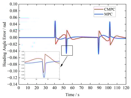 As shown in Figure 10, the heading angle error diagram of the tractor under the MPC and CMPC methods. Under steady-state conditions, the heading angle errors generated by MPC and CMPC for path tracking are both small: the heading angle errors of CMPC and MPC are both 0. Under transient conditions, CMPC is better than MPC: the heading angle range of CMPC is 0.08, and the heading angle error standard deviation is 0.013; the heading angle range of MPC is 0.1, and the heading angle error standard deviation is 0.016. The heading angle standard deviation of CMPC is reduced by 18.7% compared with that of MPC. Under total conditions: the maximum heading angle error of CMPC is 0.039 rad, and the maximum heading angle error of MPC is 0.049 rad. The standard deviation of the heading angle error of CMPC is 0.007, and the standard deviation of the heading angle error of the MPC algorithm is 0.008. The heading angle standard deviation of CMPC is reduced by 20% compared with that of MPC.