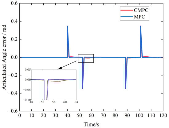 As shown in Figure 11, the articulation angle error diagram of the tractor under the MPC and CMPC methods Under steady-state conditions, both MPC and CMPC have a better control effect on articulation angle when performing path tracking: the articulation angle errors of CMPC and MPC are both 0. Under transient conditions, the control effect of CMPC is slightly better than that of MPC: the articulation angle range of CMPC is 0.69, and the standard deviation of the articulation angle error is 0.008; the articulation angle range of MPC is 0.69, and the standard deviation of the articulation angle error is 0.009. The articulation angle standard deviation of CMPC is reduced by 11.1% compared with that of MPC. Under total conditions, the maximum articulation angle error of CMPC is 0.35 rad, and the maximum articulation angle error of MPC is 0.35 rad. The standard deviation of the articulation angle error of CMPC is 0.039, and the standard deviation of the articulation angle error of the MPC algorithm is 0.041. The standard deviation of the articulation angle of CMPC is reduced by 4.9% compared with that of MPC.