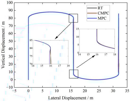 As shown in Figure 12, from the simulation results of CMPC and MPC, it can be seen that both algorithms can complete path tracking, but CMPC is more stable than MPC in the turning area. Both CMPC and MPC can complete the path tracking task well under steady-state conditions. Compared with MPC under transient conditions, CMPC has the speed standard deviation increased by 2.7%, the lateral tracking error decreased by 18.2%, the longitudinal tracking error decreased by 21.2%, the heading angle standard deviation decreased by 18.7%, and the articulation angle standard deviation decreased by 11.1%.