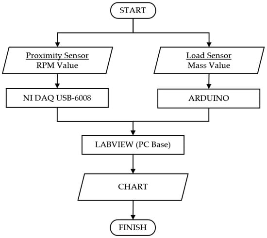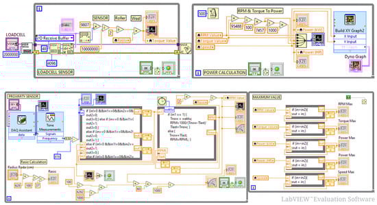 Figure 7 is a block diagram of the universal portable chassis dynamometer program that details the data reading process. The reading process consists of four stages: the proximity sensor process, which includes a program for calculating the RPM value based on the proximity sensor’s detection of gear rotation; the load cell sensor process, which involves calculating the torque value from the load cell sensor’s readings when a load is applied to the differential mechanism; the power calculation process, which calculates the power value based on the RPM and torque values; and finally, the maximum value process, which includes a program that detects the maximum value during testing. The data processing in the diagram starts with a proximity sensor and a load sensor capturing RPM and mass values, respectively. The RPM data are processed by the NI DAQ USB-6008, while the mass data are handled by an Arduino. Both processed signals are then transmitted to a PC running LabVIEW, where they are integrated and analyzed. The final output is displayed as a chart, visualizing the relationship between RPM and mass values, marking the end of the process.