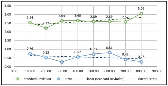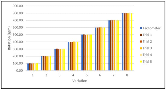 A value of 2.61 suggests that the measurements have relatively small deviations, meaning the sensor provides consistent readings in most cases. An interesting finding from this analysis is the trend of increasing standard deviation as the measured RPM values rise, as shown in Figure 9. This indicates that at lower rotational speeds (e.g., 100 RPM or 200 RPM), the sensor delivers more stable and precise results. However, as the rotational speed increases (up to 800 RPM), the variation in sensor readings also increases. Several factors could contribute to this, such as the sensor’s sensitivity to machine vibrations or greater signal fluctuations at higher speeds. At high RPM, signal fluctuations received by the sensor might lead to more variable readings. The average error of 0.55, calculated using Equation (6), when compared to tachometer measurements, suggests that the sensor has fairly good accuracy. This small error indicates that the difference between the sensor’s readings and the tachometer’s measurements is not significant.