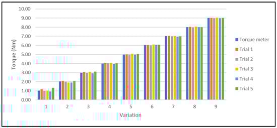 Torque measurement tests were conducted by comparing the Prony Brake system’s torque sensor readings with those obtained from a reference torque meter. The test was carried out at nine different torque levels, ranging from 1 Nm to 9 Nm, with the results shown in Figure 10.
