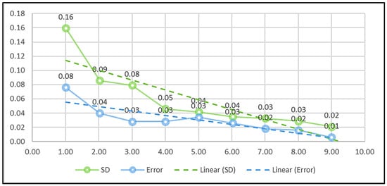 Based on the torque sensor readings using the Prony Brake system, the average standard deviation was recorded at 0.06, indicating minimal variation in the overall torque measurements. Interestingly, there is a downward trend in the standard deviation as the measured torque increases, as shown in Figure 11. At low torque, such as 1 Nm, the standard deviation reached 0.16, which shows significant fluctuations in the sensor readings. However, as the torque increased to 9 Nm, the standard deviation significantly decreased to 0.02, indicating improved sensor stability at higher torque levels. This may be due to the sensor’s ability to manage fluctuations at higher loads or a more stable signal as the torque increases. Additionally, the analysis revealed an average error of 0.03 when compared to measurements using a torque meter. At 1 Nm torque, the error reached 0.08, which is relatively high. However, as the torque increased, the error decreased significantly. At 9 Nm, the error was recorded at just 0.01, demonstrating improved sensor accuracy at higher torque levels. This reduction in error could be attributed to factors such as increased sensor sensitivity at higher loads or reduced influence from external factors affecting the sensor readings at lower torque levels.