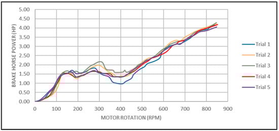 Based on the data shown in Figure 13, it can be seen that BHP gradually increases with rising RPM, peaking at around 4.5 HP at approximately 800 RPM. Although there are some fluctuations at the beginning of the graph, overall, BHP shows a stable upward trend, particularly after around 300 RPM.