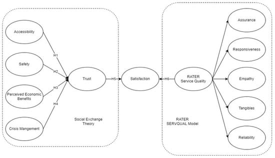 A service relationship’s effectiveness is greatly influenced by both customers and service providers [43]. Customers’ degree of agreement has a big impact on their perception of service quality and customer trust. Additionally, the distinctive and vital role of service provider orientation fosters trust and enhances service quality. According to Kospandani and Wahyudi [44], trust is the main cause of loyalty when service quality and qualities are improved. In their analysis of Indonesia’s electric railway system, the COVID-19 strategy successfully gained customers’ trust in public transportation by analyzing satisfaction, trust, and loyalty during the pandemic. Loyalty to public transit is influenced by user perceptions of significance, the quality of service, and interpersonal relationships [34]. The importance of public transportation is highlighted by the fact that the best measures of its quality are the willingness to continue using it, overall satisfaction, and the use of the service. As a result, the following hypothesis was proposed: