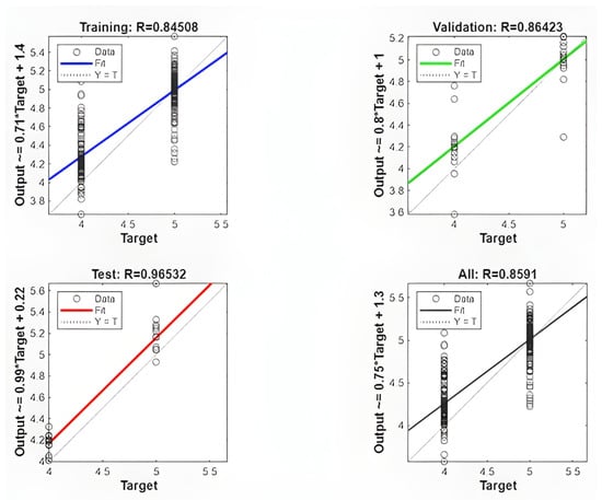 A total of 30 iterations per parameter combination (70:15:15; 80:10:10; 90:5:5 for the training:testing:validation ratio) were performed with 10 and 20 hidden layers using the Levenberg–Marquart algorithm. The purpose of this approach was to identify the most stable output with the highest r-squared value, a key indicator of predictive accuracy. According to Öztürk and Başar [97], an r-squared value between 70% and 90% is considered acceptable, with higher values indicating greater predictive power. As shown in Figure 2, the analysis achieved a high r-squared value of 85.91% overall and 96.53% on the testing output, confirming the overall robustness of the model and prediction of satisfaction. This was further supported by the 86.42% validation output from the 84.51% training output.