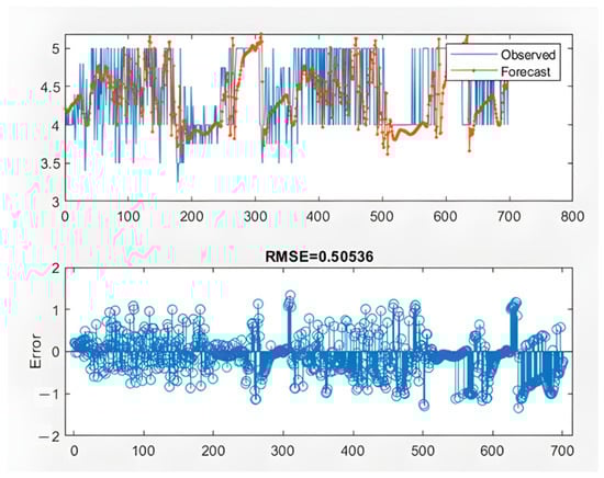 The optimum parameter served as the processing for completing the LSTM optimization process, which only had 1 min and 2 s over 250 epochs of a complete iterative run. The model’s initial observed output (Figure 3) demonstrated a low root mean square error (RMSE) of 0.5054, indicating a reasonable predictive performance. Further model updates and LSTM tuning improved accuracy, yielding an even lower RMSE of 0.0817 (Figure 4). This significant reduction in error highlights the enhanced forecast capability of the LSTM model after optimization.