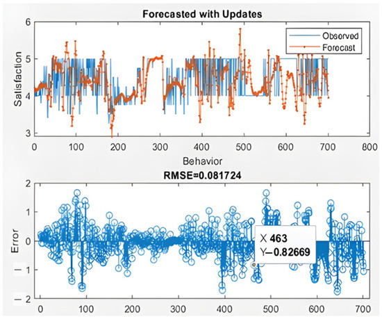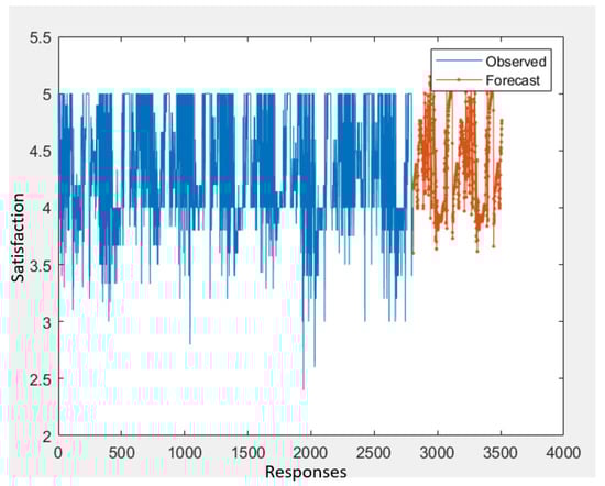 Figure 5 illustrates the forecasted passenger satisfaction regarding e-public transportation (Doha Metro). The y-axis represents the satisfaction (one as strongly dissatisfied and five—strongly satisfied), while the x-axis represents the responses. The results revealed a predominantly positive sentiment, with satisfaction scores clustering between four and five on the scale. This suggests that most passengers are either satisfied or very satisfied with the service provided by the Doha Metro. The high satisfaction levels among the Doha Metro commuters can be attributed to its exceptional service quality, reliability, safety, and accessibility. The metro maintains a service reliability of 99.85% and a punctuality of 99.66%, ensuring minimal delays and a seamless travel experience [100]. Safety remains a top priority, with an accident frequency rate of just 0.01 and approximately 90% of passengers perceiving it as a secure mode of transport. Furthermore, customer satisfaction surveys report an overall approval rating of 99.66%, reflecting the metro’s commitment to service excellence. The system’s accessibility, air-conditioned trains, comfortable seating, and integration with other transport options further enhance commuter convenience [6]. These factors collectively justify why the majority of passengers rate their experience positively, with satisfaction scores clustering between four and five.