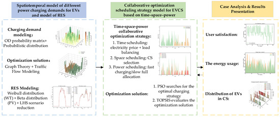 This study proposes a spatiotemporal-power collaborative optimization scheduling framework for EV charging. The framework establishes a comprehensive model for EV charging demand, incorporating the temporal and spatial variations in both fast and slow charging requirements. It also integrates the uncertainties associated with RES, wherein wind power output is modeled using Weibull distributions and solar power output is modeled using Beta distributions. Additionally, a dynamic traffic network simulation is employed to capture the fluctuations in mobility patterns and provide a realistic representation of EV charging demand.