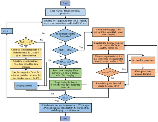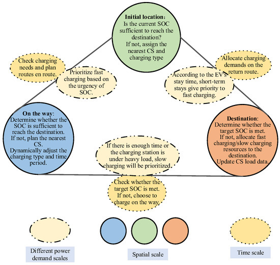 Figure 2, the time dimension is affected by electricity price fluctuations, peak traffic periods, and CS load, all of which determine the optimal charging timeframe. The spatial dimension is defined by the vehicle’s initial location, travel route, and destination, impacting CS selection. Meanwhile, the power dimension considers battery capacity, charging urgency, and available stopover time, dictating whether fast or slow charging is required. Given these interdependencies, this study proposes a time–space–power collaborative optimization strategy that dynamically adjusts CS selection, charging time, and charging type to maximize user satisfaction while balancing grid load and RES utilization.