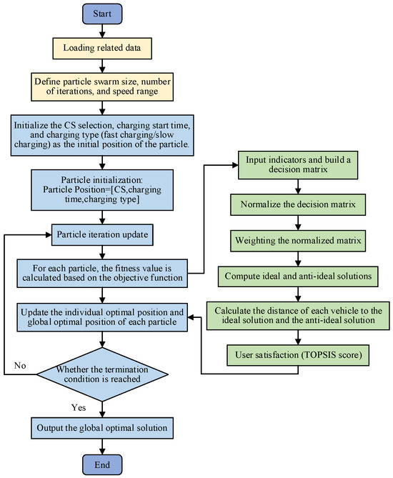 In light of these considerations, combining PSO and the TOPSIS method allows for an integrated approach that not only optimizes the charging scheduling plan but ensures that user satisfaction is adequately accounted for. This hybrid approach aligns well with the problem at hand and is therefore adopted in this study to achieve a balanced and efficient solution. Furthermore, the proposed approach is designed for large-scale charging networks, which require distributed computing and real-time data integration to effectively manage charging stations and adapt to changing energy demands. The solution process is as follows: