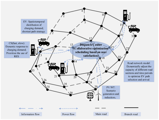 Section 4 (e.g., the objective function in Equation (23) and the constraints in Equations (28)–(48)). The experimental environment is based on a 33-node dynamic road network, with three CSs strategically placed at nodes 3, 15, and 21. Each CS offers both fast charging (30 kW) and slow charging (7 kW) services. Specifically, the number of fast charging piles is set as 1, 2, and 3 for the respective CSs, while the number of slow charging piles is 13, 8, and 15. The simulation considers 100 EVs, each with a battery capacity of 100 kWh, a target SOC of 90%, and a charging efficiency of 90%. All 100 EVs are assumed to participate in the dispatch process. This setup aligns with the energy requirement and charging power constraints specified in Equations (27)–(31). The electricity price is divided into grid and RES electricity prices. The grid electricity price is 0.75 yuan/kWh during the day, 0.33 yuan/kWh at night, and 0.54 yuan/kWh during the standard period, while the RES electricity price is 0.35 yuan/kWh during the day, 0.15 yuan/kWh at night, and 0.24 yuan/kWh during the standard period. These price settings directly influence the cost component of the objective function (Equation (24)). Traffic conditions are modeled by varying congestion coefficients according to time period and road type. During peak hours, the congestion coefficients for main roads and branch roads are 1.3 and 1.2, respectively, and 1.1 and 1.0 during non-peak hours. These coefficients are used to compute travel times (see Equation (26)).