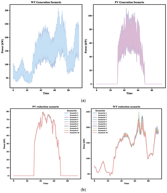 Figure 6 depicts the wind and solar output scenarios for typical day, highlighting the fluctuating availability of renewable energy resources. These scenarios are crucial for analyzing the impact of renewable energy integration on the scheduling strategy. To ensure consistency with the constraints and optimization framework, the most likely scenario from the generation and reduction cases is selected for further analysis.