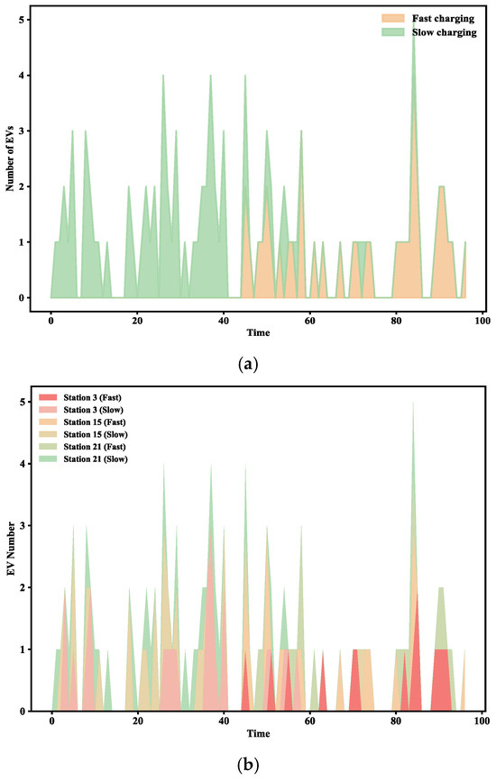 Figure 7a illustrates the spatiotemporal distribution of fast and slow charging demand. Fast charging demand peaks during the morning (07:00–09:00) and evening (15:00–19:00) commuting hours, while slow charging demand is more dispersed and concentrated during off-peak periods.