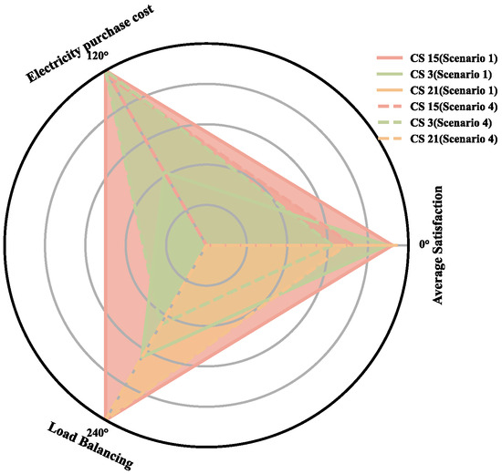 Figure 9 illustrates the optimization effects across three CSs under different scheduling scenarios. A radar chart comparison between Scenarios 1 and 4 reveals significant improvements post-implementation: for instance, CS 3 demonstrates marked enhancements in user satisfaction and load balance alongside a substantial reduction in electricity costs; CS 15 experiences an increase in user satisfaction exceeding 30%, a reduction in electricity costs of more than 20%, and an approximate 90% improvement in load balance; similarly, CS 21 shows nearly a 20% increase in user satisfaction, an 18% reduction in electricity costs, and an 85% improvement in load balance.