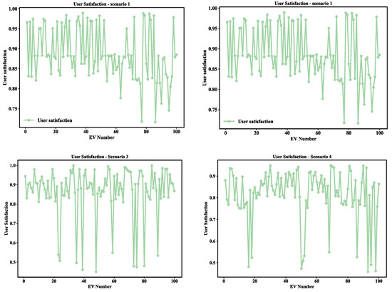Figure 10 shows the distribution of user satisfaction under the four scheduling scenarios, reflecting the impact of different scheduling strategies on user experience. In Scenario 1, user satisfaction is generally high and fluctuates less, maintaining a level above 0.80, indicating that coordinated scheduling can effectively balance the resource allocation between CSs, avoid excessive congestion and uneven resource allocation, and thus maintain high and stable user satisfaction. By contrast, Scenario 2 shows large fluctuations in satisfaction, especially during peak hours, when the satisfaction of some users drops below 0.5. This shows that, in the absence of coordinated scheduling, CSs cannot reasonably coordinate demand, resulting in resource contention and long waiting times, which greatly affects user experience. In Scenario 3, although user satisfaction remains above 0.85 and is relatively stable most of the time, it still decreases compared with Scenario 1. This shows that, although the partial load problem is alleviated through spatial optimization, the flexibility of single-power charging is low and the charging efficiency is not fully improved as with multi-power scheduling. Scenario 4 performs the worst, with generally low user satisfaction and large fluctuations, especially during peak hours, when satisfaction drops below 0.5 for some periods. This result shows that the single-power and uncoordinated scheduling strategy cannot effectively cope with peak demand, resulting in uneven resource allocation, which seriously affects user satisfaction.