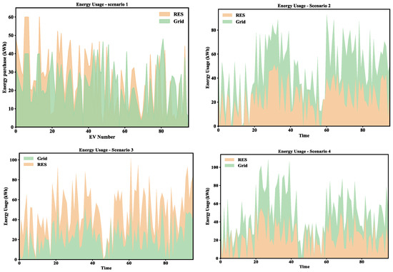 Figure 11 shows the energy usage in four scheduling scenarios, analyzing the distribution of electricity usage from RESs and the power grid. In Scenario 1, the utilization rate of RESs is high and the demand for power purchase from the power grid is relatively low. This shows that coordinated scheduling can effectively match charging demand with the generation of RESs, reduce dependence on the power grid, and thus reduce the cost of power purchase. By contrast, Scenario 2 shows a significant increase in the demand for power purchase from the power grid, especially during peak hours, when the utilization rate of RESs is low in some time periods. The lack of a spatially optimized scheduling strategy makes charging demand concentrated in certain time periods, resulting in insufficient utilization of RESs and increased dependence on the power grid. In Scenario 3, the utilization rate of RESs is still high, but due to the use of single power scheduling, the demand for power purchase from the power grid has increased compared with Scenario 1. The limitation of single power scheduling reduces flexibility, resulting in a higher demand for power purchase from the power grid in certain time periods. Scenario 4 shows the highest demand for power purchase from the power grid and the lowest utilization rate of RESs, especially during peak hours, when the load demand of the power grid increases significantly. This shows that the strategy fails to effectively coordinate charging demand with the supply of RESs, resulting in an increased burden on the power grid and an increase in the cost of power purchase.