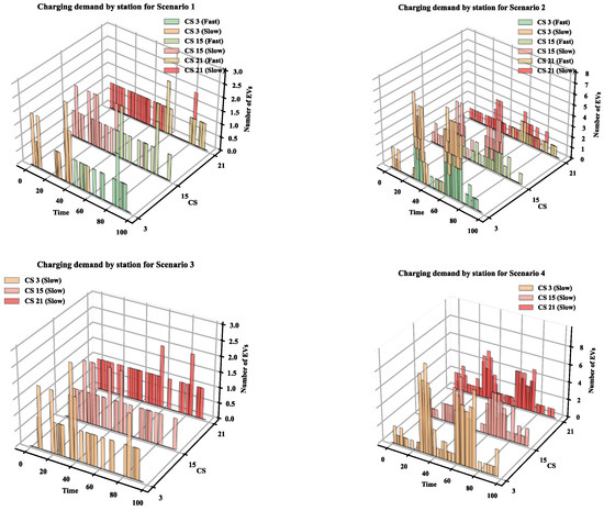 Figure 12 displays the number of fast-charging and slow-charging EVs at different charging stations (CS 1, CS 3, CS 15, and CS 21) across various time periods. In Scenario 1, the distribution of charging demand among the CSs is relatively balanced, and the demand for fast charging and slow charging is effectively balanced. Especially during the fast charging period, the demand of CSs 3 and 21 is stable, and the load distribution is relatively uniform, avoiding excessive congestion during peak hours. By contrast, the distribution of charging demand in Scenario 2 is relatively uneven, especially during peak hours, when some CSs have concentrated demand, resulting in congestion. Other CSs have low loads, and the demand of each CS cannot be effectively balanced, resulting in uneven resource utilization. In Scenario 3, there is still a certain imbalance in charging demand, the slow charging demand is especially concentrated in a few CSs (such as CS 3 and CS 15). Although spatial optimization alleviates load concentration, the flexibility of single power scheduling is insufficient, resulting in insufficient resource utilization in some periods. Scenario 4 shows the most serious demand imbalance, especially during peak hours, when some CSs are in excessive demand, while other CSs are not fully utilized, causing excessive congestion and failing to maximize resource utilization efficiency.