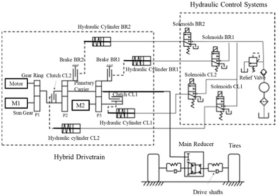 Figure 1. The motor can select the electric mode or power generation mode according to the actual demand, so it can also be expressed by M/G1 and M/G2. The system does not use a traditional transmission, but uses three coupled planetary gear sets (P1, P2, P3) and four clutch/brake configurations (CL1, CL2, BR1, BR2).
