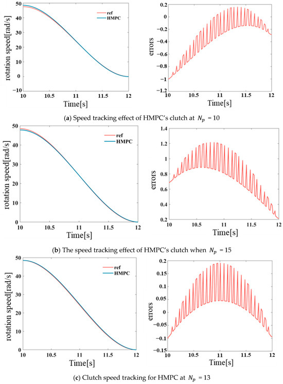 Figure 6, the rotational speed tracking capability of brake BR1 on the reference trajectory is demonstrated under various HMPC prediction time domains. Subsequent to the execution of repeated tests on distinct prediction time domains, it was ascertained that when the prediction time domain is set to 13, brake BR1 exhibits the optimal tracking capability on the reference trajectory. This results in the minimization of impact degree and sliding friction work generated during mode switching. Consequently, simulation and analysis are conducted for the HMPC prediction time domain of 13.