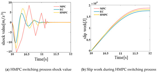 Figure 7, a comparison of the impact degree and slip work between HMPC and MPC and EC in the hybrid mode switching process is demonstrated. The simulation results indicate that the impact degree of the hybrid mining dump truck in the mode switching process based on HMPC is less than 13
