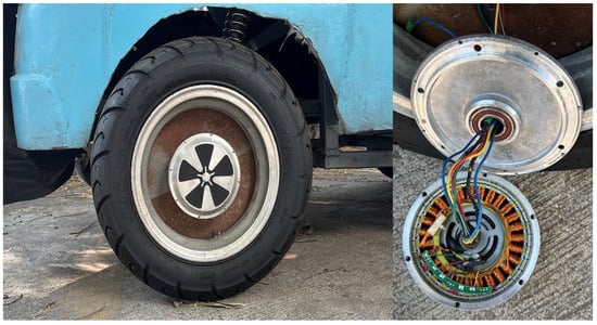 There are five types of EM suitable for electromobility: induction motors, direct-current motors, synchronized permanent magnet motors, BLDC motors, and switched reluctance motors [2,4]. BLDC motors are the most popular in electromobility, while the induction motor is the most advanced technology for EV applications [5]. BLDC motors weigh less and are smaller than a brush motor that has equal power, making them ideal for reducing space [6]. Thus, HMs allow for more space for passengers and simplify the mechanics of the car, improving handling [6] and making them suitable for urban use. Additionally, an HM on each wheel is controlled independently [7]. HMs are used in bicycles, motorcycles, scooters, solar cars, and many other lightweight EVs [8,9]. These EVs are practical, economical, and eliminate environmental pollution, and, due to their manufacturing size, they also reduce road congestion in cities.
