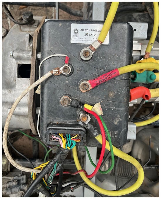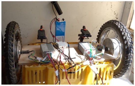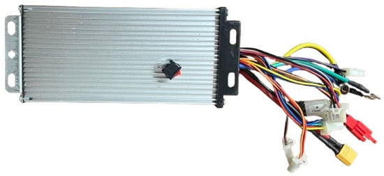 Each BDCL-type motor uses a controller to regulate the speed (see Figure 3). In this case, two controllers are used, each with an operating voltage of 36 to 48 V, with a 5-wire connector to the Hall sensors for position and speed control, a 3-wire connector for three-phase power supply within the HM motor, a two-wire input connector for power to the 36 V battery, a 3-wire output connector to connect a throttle that operates at 4.5 V, a pair of output wires that interconnects with reverse motion, and several cables with their respective connectors for accessories such as switches, speakers, lights, etc.