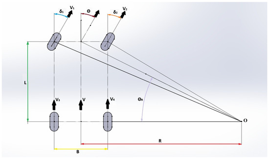 According to Ackermann’s model, Figure 6 depicts a four-wheeled vehicle turning right on a sharp curve, where V is the speed of the vehicle; V1, V2, V3, and V4 are the speeds of each of the wheels; and are the angles of each front wheel; R is the turning radius of the vehicle; L is the distance between the front and rear axles; B is the wheel separation distance; and O is the center of the turning radius.