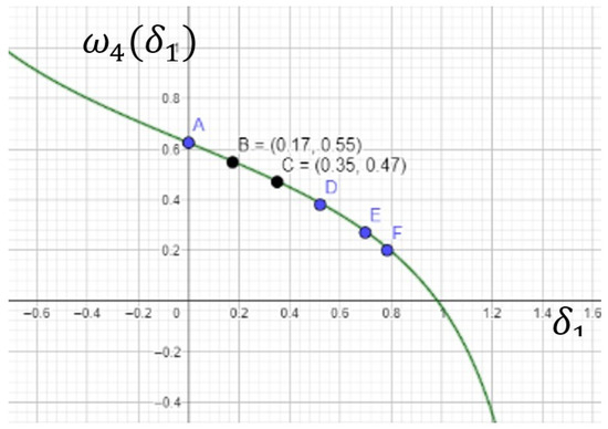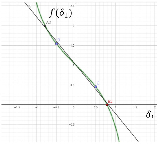 In Figure 7, the line in black corresponds to the linear regression between the points: {((0.79, 0), (−0.79, 2), (0.5, 0.45), (−0.5, 1.55))}. This line obeys the following equation: